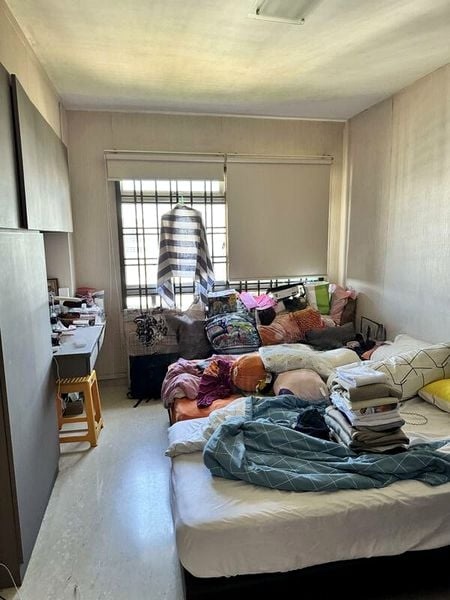 This well-maintained unit features three spacious bedrooms, each equipped with ceiling fans and air conditioning for ultimate comfort. The master bedroom boasts a luxurious built-in wardrobe with marble-patterned doors, while the modern bathroom showcases elegant grey stone-look tiles and a glass shower partition. A dedicated study area with storage shelving offers a perfect workspace, making this home ideal for families or professionals alike.