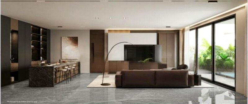 Step into a sanctuary of light and space at Gentle Villas, where polished stone flooring and modern pendant lighting create an inviting ambiance. The expansive living area, adorned with crown molding and large windows, offers a seamless connection to the lush greenery outside, filling the home with natural light and a sense of tranquility.