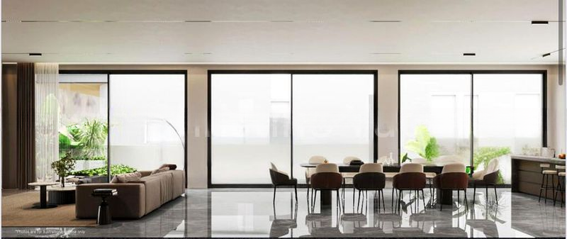 Step into a sanctuary of light and space at Gentle Villas, where polished stone flooring and modern pendant lighting create an inviting ambiance. The expansive living area, adorned with crown molding and large windows, offers a seamless connection to the lush greenery outside, filling the home with natural light and a sense of tranquility.