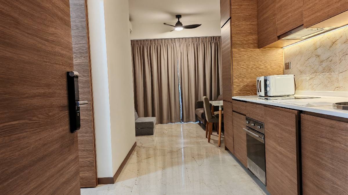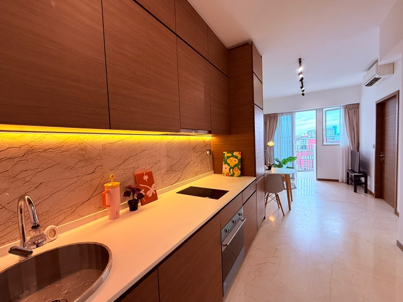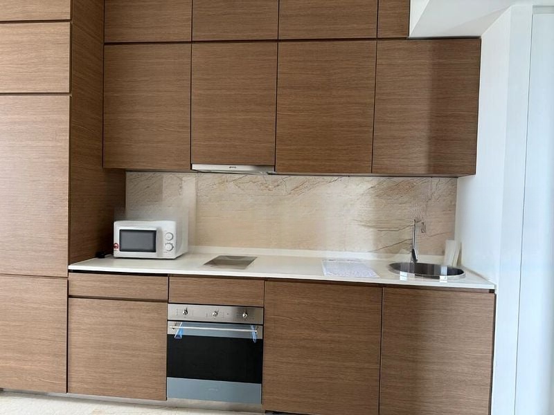 This thoughtfully laid-out unit features a stylish galley kitchen equipped with dark wood cabinetry and a marble-look backsplash, perfect for culinary enthusiasts. The bedroom boasts a padded headboard with LED backlighting, a large sliding wardrobe, and designer pendant lighting, ensuring a restful retreat. The bathroom is a masterpiece of design with full marble-look tiling and a glass shower partition, providing a spa-like experience at home.