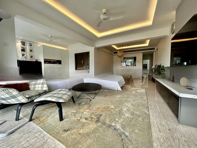 This spacious 5-bedroom unit features an open-concept layout, seamlessly connecting the living and dining areas. The living room boasts a minimalist staircase and a light wood TV console, while the dining area showcases a built-in glass-front wine cabinet and a skylight that enhances the dining experience. Each bedroom is thoughtfully designed, with the master bedroom offering an integrated headboard with cove lighting and a luxurious backlit circular mirror.