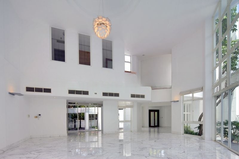 Step into a realm of elegance and tranquility as you enter this exquisite landed home at Villas Holland. The bright and airy ambiance is accentuated by abundant natural light streaming through the floor-to-ceiling windows, highlighting the stunning white marble flooring and the impressive double-volume high ceiling. The large glass skylight roof invites the outdoors in, creating a seamless connection with the lush greenery that surrounds the property.