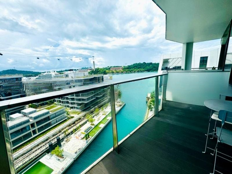 Step into a world of elegance as you enter this beautifully designed unit at Corals at Keppel Bay. The abundant natural light floods the open-concept living and dining area, highlighting the exquisite marble-look floor tiles and the striking dark wood feature wall. Enjoy breathtaking views of the waterfront, greenery, and the cityscape from your private balcony, where designer pendant lighting adds a touch of sophistication.