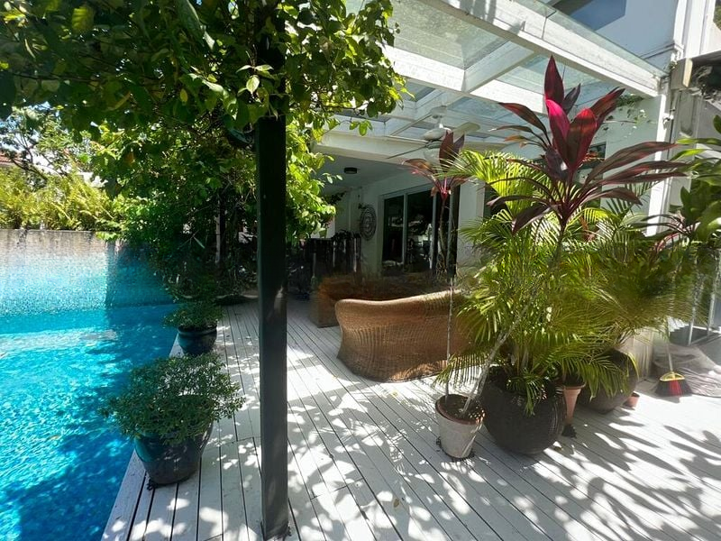 Step into a bright and airy oasis where abundant natural light floods every corner of this beautifully renovated home. The modern white facade and stone-clad retaining wall create an inviting first impression, while the glass-roofed patio beckons you to relax amidst the lush greenery and tranquil pool views.