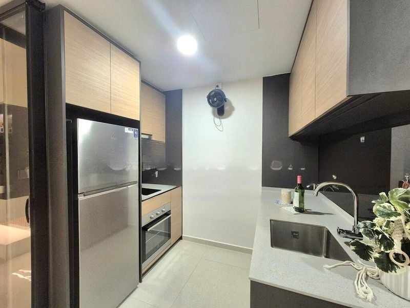 This well-maintained unit features two spacious bedrooms, including a master suite with an en-suite bathroom boasting a luxurious rain shower and marble-look wall tiles. The galley kitchen is equipped with built-in appliances, including a stainless steel refrigerator and induction hob, perfect for culinary enthusiasts. Enjoy the convenience of a sliding wardrobe and a dedicated study area in the second bedroom, making this home ideal for both relaxation and productivity.