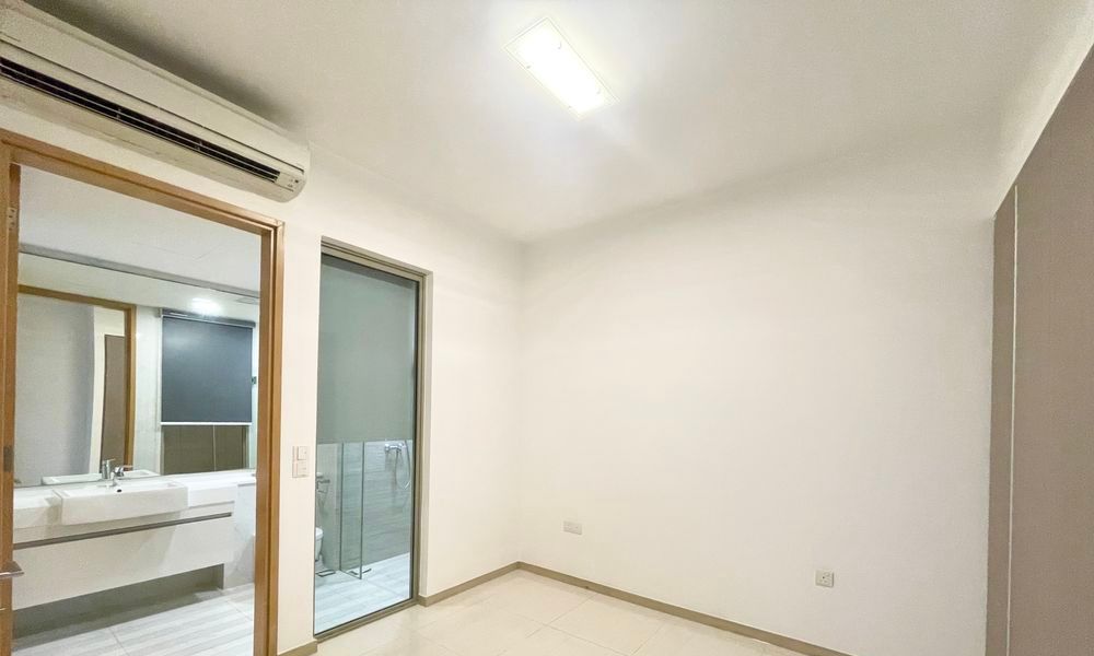 This thoughtfully designed unit features a spacious living room with tiled flooring and a wooden TV console, seamlessly connecting to the outdoor balcony. The dining area boasts a long wooden table, ideal for family gatherings. Both bedrooms are equipped with built-in wardrobes and ample storage, while the bathrooms showcase contemporary fixtures, including a walk-in shower with a glass partition and a floating vanity.