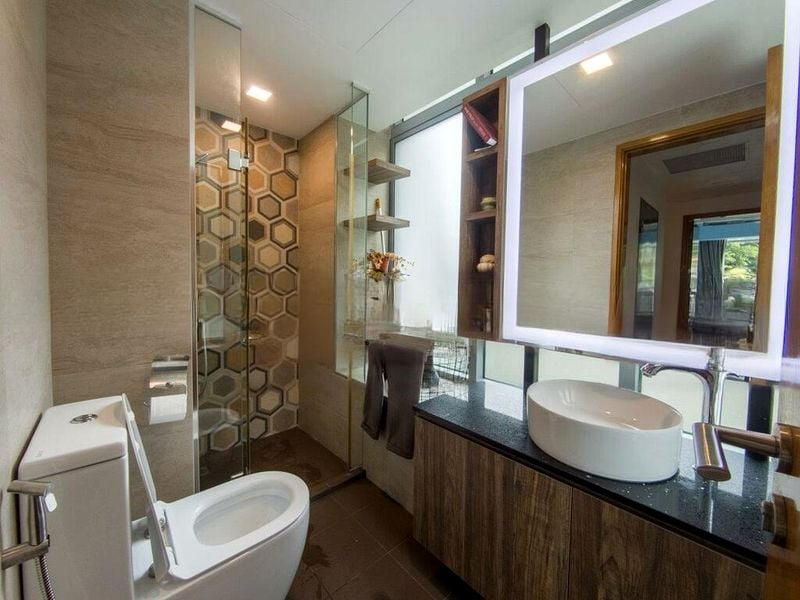 This well-maintained 2-bedroom unit features a functional layout, highlighted by a spacious living area with a built-in TV console, a stylish kitchen with blue cabinetry and stone countertops, and a luxurious bathroom showcasing backlit mirrors and hexagonal tiles. Each bedroom offers ample storage with built-in wardrobes, while the study room provides a quiet nook for productivity. Enjoy the convenience of an integrated laundry area and outdoor space designed for comfort.