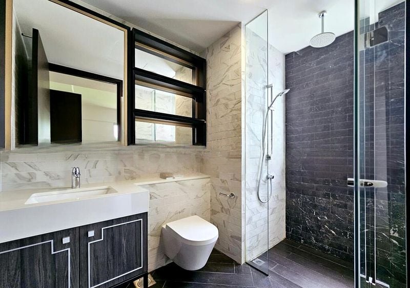This efficient 2-bedroom, 2-bathroom layout features a master suite with an en-suite bath, complete with a luxurious walk-in shower and elegant marble-patterned wall tiles. The open-concept kitchen boasts dark cabinetry with white trim, a stylish subway tile backsplash, and high-end built-in appliances. Each bedroom is fitted with built-in wardrobes featuring sleek black trim, ensuring ample storage while maintaining the unit's clean aesthetic.