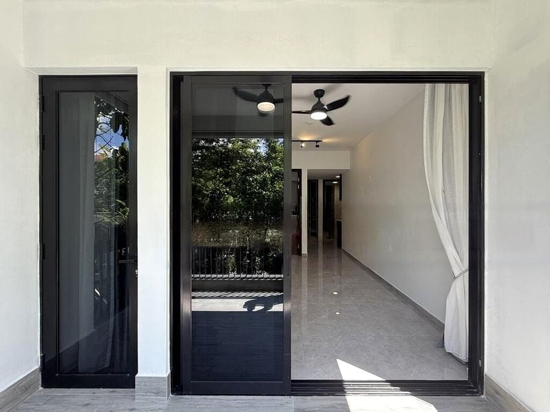 Step into a serene oasis where modern minimalist design meets comfort. The polished floor tiles reflect natural light, creating a bright and inviting ambiance throughout the unit. Enjoy tranquil views of lush greenery from the living area, enhanced by sliding glass doors that lead to a private balcony, perfect for unwinding after a long day.
