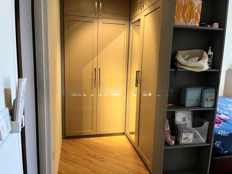 This well-maintained unit features three spacious bedrooms, including a master suite with floor-to-ceiling built-in wardrobes and convenient en-suite bathroom access. The galley kitchen boasts ample storage with light wood cabinetry and sleek black hardware, perfect for culinary enthusiasts. Every corner of this home reflects thoughtful design, from the mirrored bathroom cabinet to the under-cabinet lighting in the master bedroom.