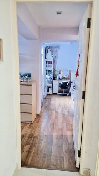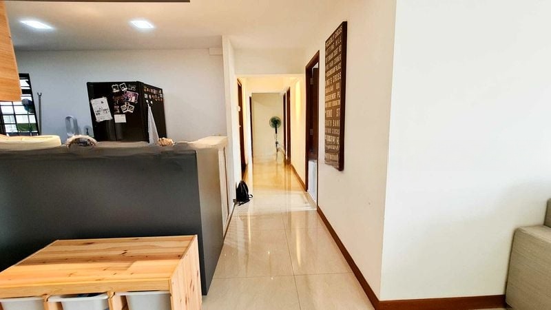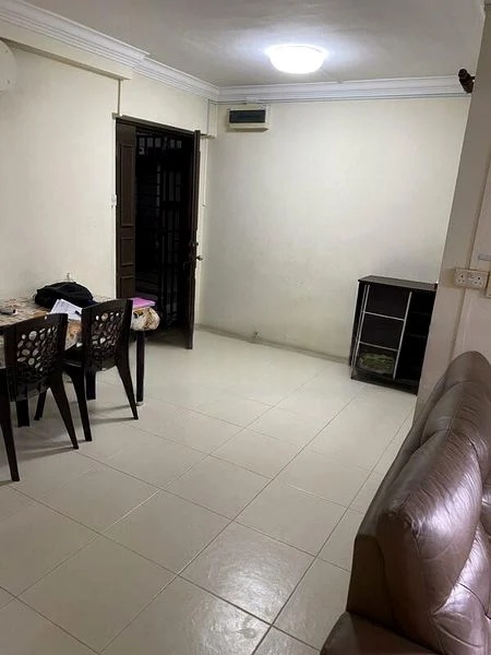 Step into this functional HDB flat where simplicity meets comfort. The open layout of the living and dining area invites natural light to dance across the tiled flooring, creating a warm and welcoming ambiance. Large windows adorned with patterned curtains offer glimpses of the neighboring buildings, while ceiling fans with integrated lighting enhance the space's practicality.