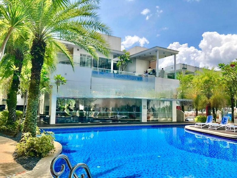 Step into a bright and airy sanctuary where abundant natural light dances across polished parquet flooring. The inviting ambiance is enhanced by decorative wall niches and ceiling fans, creating a refreshing atmosphere. Enjoy stunning views of the large swimming pool, lush greenery, and the city skyline from your spacious living areas.