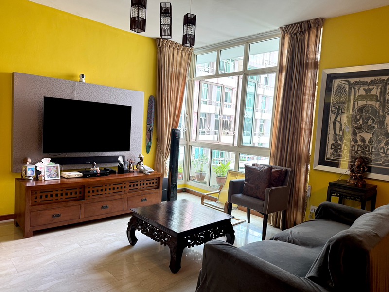 This well-maintained unit features an open-concept layout that connects the dining area with pendant lighting to the living room, perfect for entertaining. Each of the three bedrooms boasts parquet flooring and built-in wardrobes, while the master bedroom includes a dedicated study desk area. The kitchen is equipped with built-in overhead cabinets, providing ample storage in an enclosed layout.