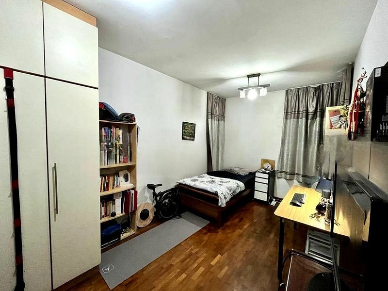 Step into a warm and inviting atmosphere where classic parquet flooring meets polished stone tiles, creating a seamless flow throughout the living spaces. The large window in the living room invites moderate natural light, enhancing the cozy ambiance while offering views of lush greenery and neighboring residential blocks.