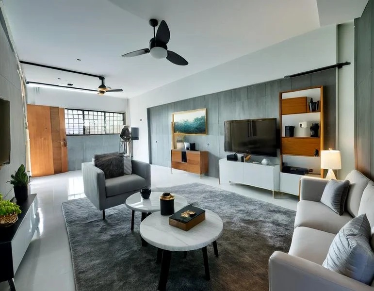 Step into this beautifully renovated HDB flat and be greeted by a harmonious blend of modern minimalist design and city skyline views. The space is bathed in natural light, highlighting the elegant finishes such as the gold-framed glass shower enclosure and the marble-top dining table, creating an inviting ambiance that feels both luxurious and comfortable.
