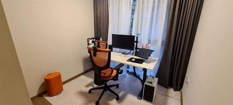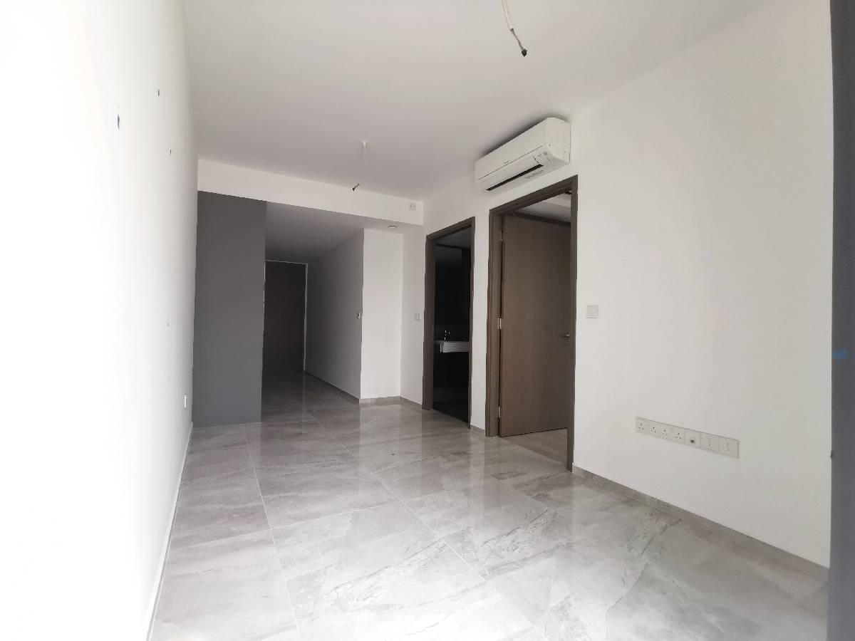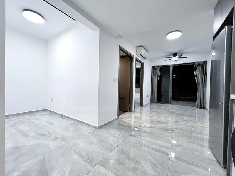 This well-maintained 3-bedroom, 2-bathroom unit features standout highlights such as a spacious kitchen island with seating, a built-in oven, and a luxurious bathroom with a walk-in shower and vessel sink. The ergonomic study setup and full-length vanity mirror add practicality and style, making this home perfect for both relaxation and productivity. The enclosed balcony concept in the dining area provides an intimate space for gatherings, framed by dark accent walls and sheer curtains.