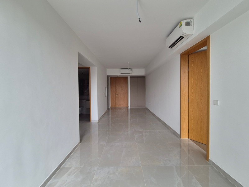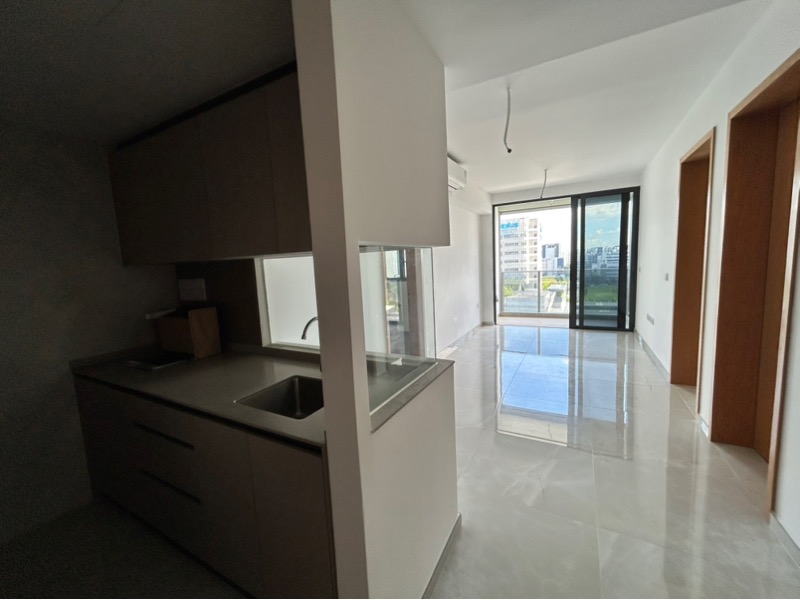 Step into a brand-new sanctuary where abundant natural light floods the open-concept living space, accentuating the polished floor tiles and modern minimalist finishes. The sliding glass doors seamlessly connect the living room to a private balcony, offering stunning views of both the city skyline and lush greenery, creating an inviting ambiance that feels both spacious and serene.