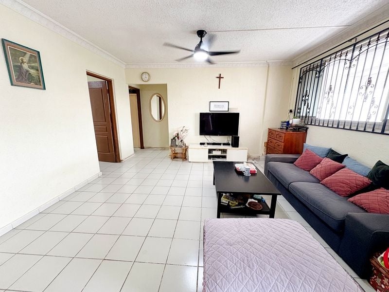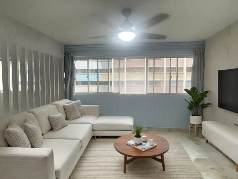 Step into a warm and inviting space where natural light dances across the wood-look laminate flooring, creating a cozy ambiance that instantly feels like home. The spacious open-plan living and dining area features large windows that frame picturesque views of the lush landscaped garden and neighboring HDB blocks, providing a serene backdrop to your everyday life.