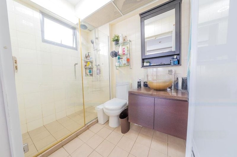 This well-maintained 3-bedroom unit features a thoughtful layout that maximizes space and comfort. The master bedroom boasts a full-length mirror and ample natural light, while the study room is perfect for productivity with its long work desk and wall-mounted shelves. The bathrooms are tastefully designed, showcasing gold-framed shower stalls and vessel sinks that elevate your daily routine.