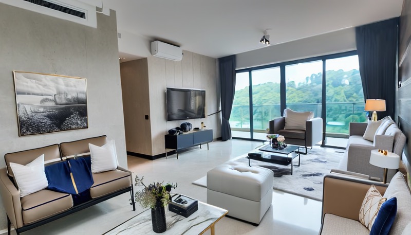 This exquisite unit features a modern island kitchen equipped with black stone countertops, integrated appliances, and minimalist handleless cabinetry, making it a chef's dream. The generous living space flows effortlessly into the balcony, which boasts wood-textured floor tiles and ample room for outdoor lounging and dining. Each of the five bedrooms is designed with comfort in mind, featuring split-unit air conditioning and thoughtful layouts that enhance privacy and functionality.
