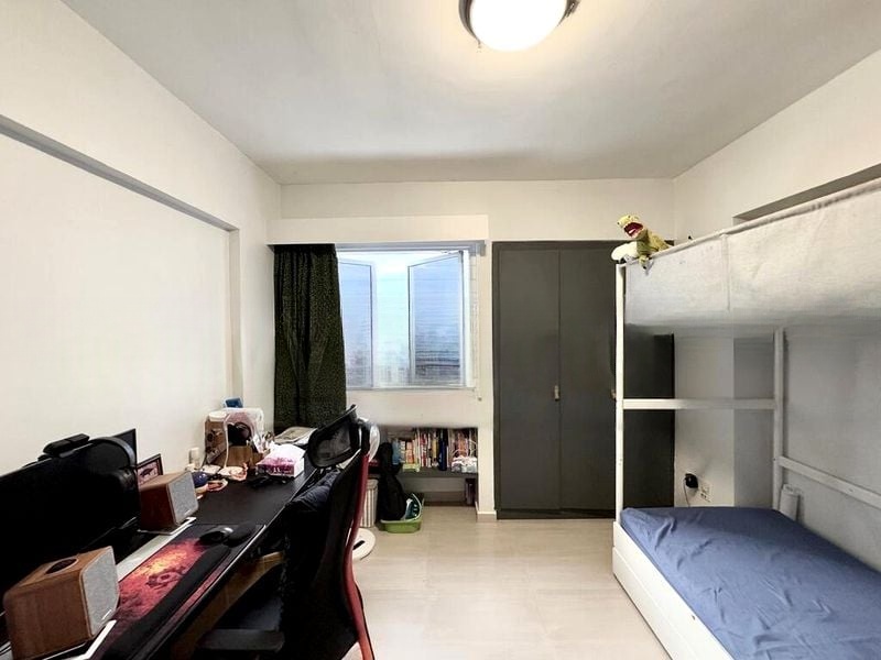 This well-maintained 3-bedroom unit boasts a galley kitchen with integrated laundry yard, perfect for the modern family. The master bedroom offers ample space for a study desk and treadmill, complemented by wood-look vinyl flooring and grey blackout curtains. Both common bedrooms are equipped with full-height mirrored wardrobes and versatile setups, catering to various needs.