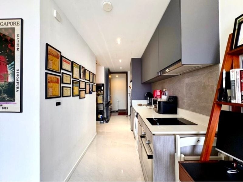 Step into a serene oasis at Riverfront Residences, where abundant natural light floods the modern minimalist space, accentuating the sleek finishes and inviting ambiance. The living room features a plush brown leather sofa and a stylish dark wood TV console, seamlessly connecting to a private balcony that offers unblocked views of lush greenery and residential blocks.