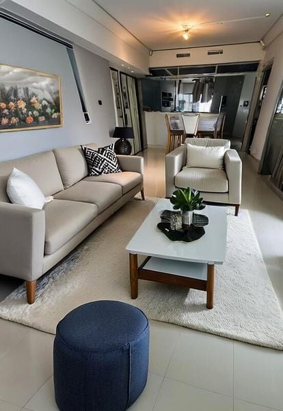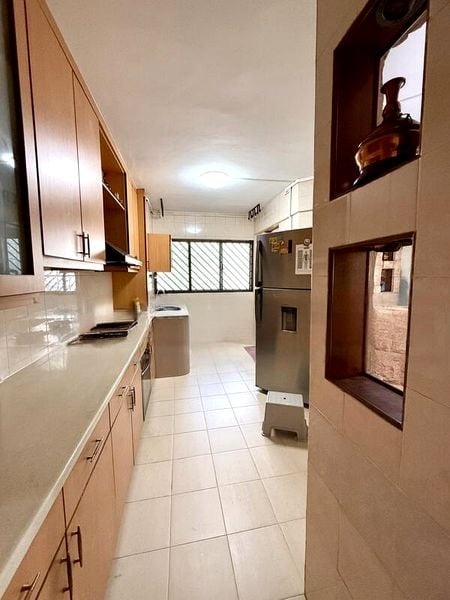 Step into a world of modern minimalist elegance in this beautifully renovated HDB flat. The moment you enter, you are greeted by the warm ambiance created by dark wood flooring and wood-clad feature walls. Floor-to-ceiling mirrored walls reflect the natural light, enhancing the spacious feel while offering serene views of lush greenery outside.