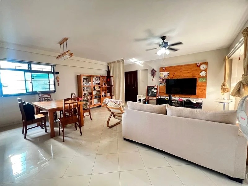 Step into a bright and airy sanctuary, where abundant natural light floods the open-concept living and dining area, accentuating the elegant wooden TV feature wall. The ambiance is inviting, with views of urban greenery and neighboring residential blocks that create a serene backdrop for your daily life.