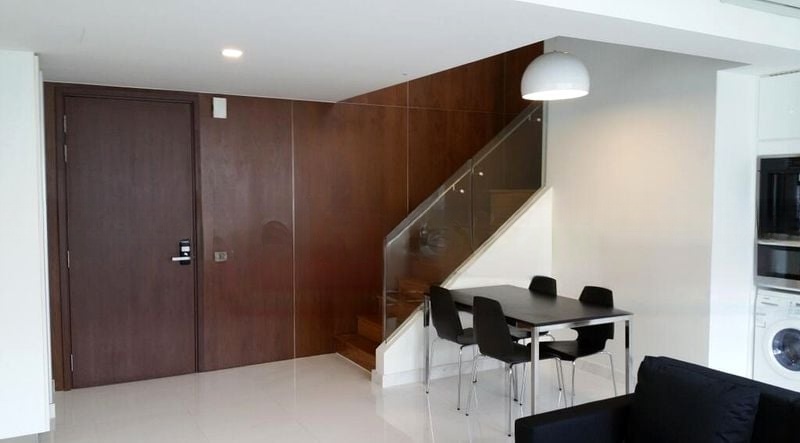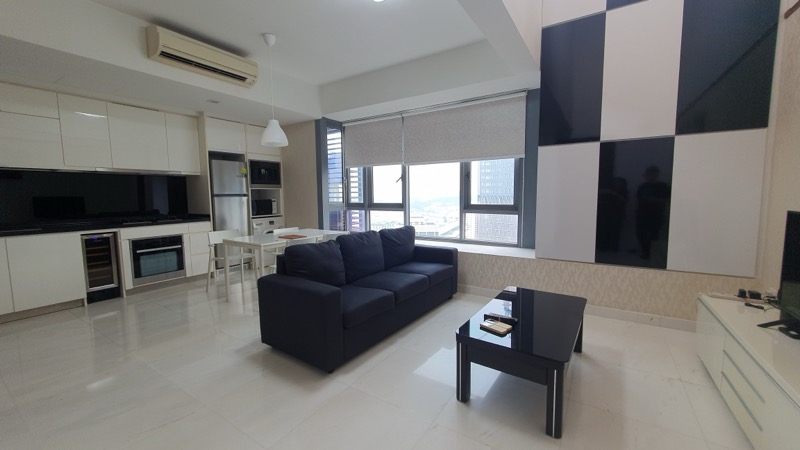 Step into a world of modern elegance as you enter this beautifully designed duplex loft at ALTEZ. The abundant natural light floods through the floor-to-ceiling windows, illuminating the open-concept living and dining area, where a striking dark wood feature wall adds a touch of sophistication. The glass staircase railing enhances the airy ambiance, creating a seamless flow throughout the space.