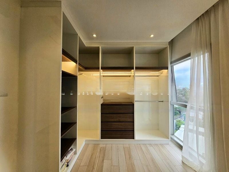 Step into a bright and functional living space that welcomes you with its elegant herringbone parquet flooring and modern finishes. The natural light pours in through sliding glass doors, leading you to a private curved balcony where you can unwind while enjoying views of lush greenery and surrounding residential buildings.