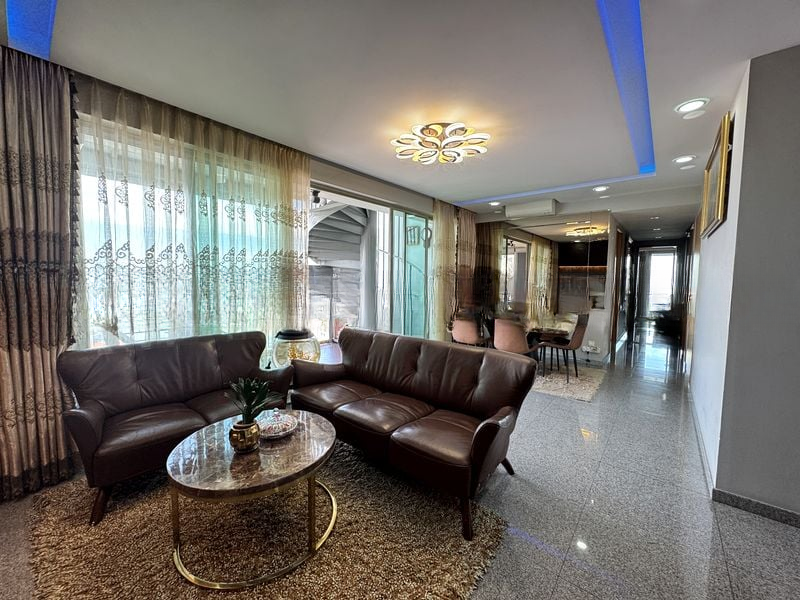 Step into a world of modern luxury as you enter this exquisite 4-bedroom unit at Casa Merah. Bathed in abundant natural light, the living room captivates with its polished tile flooring, a stunning marble TV feature wall, and an integrated fish tank that adds a unique touch. The blue LED recessed lighting and designer chandeliers create an inviting ambiance, perfect for both relaxation and entertaining.