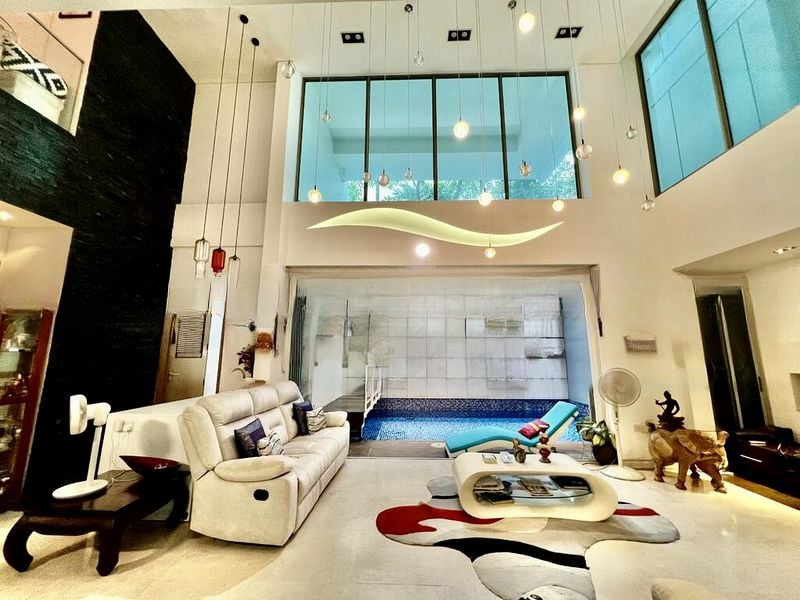 This well-maintained 4-bedroom, 4-bathroom unit boasts a unique layout with a double-volume high ceiling and a mezzanine level that overlooks the living area. The open-concept living room seamlessly connects to the private indoor pool, adorned with blue mosaic tiles and a slatted roof that enhances the sense of space. The galley kitchen features integrated appliances and white gloss cabinetry, perfect for culinary enthusiasts. Each bedroom offers comfort and style, with large windows and thoughtful design elements.