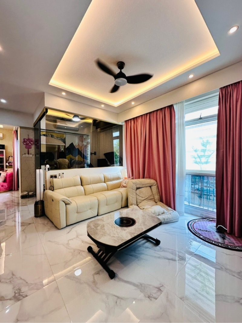 Step into a world of modern glamour as you enter this stunning unit at Palmwoods. The marble-look porcelain flooring glistens under the gentle glow of recessed ceiling lighting, while the urban views create a vibrant backdrop. The open-concept living room, adorned with pink blackout curtains and a large TV feature wall, invites you to unwind in style.