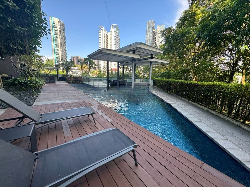 Step into a world of modern elegance as you enter this beautifully renovated unit at FULCRUM. Bathed in abundant natural light, the open-concept living area features sleek track lighting and a stylish grey sofa, creating an inviting ambiance. Enjoy breathtaking views of the city skyline and lush greenery from your living space, seamlessly blending indoor comfort with outdoor tranquility.