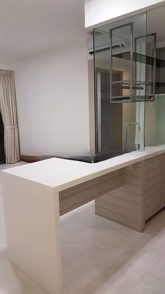 This well-maintained 2-bedroom, 2-bathroom unit features standout elements such as a stylish breakfast bar, integrated kitchen appliances, and luxurious floating bathroom vanities. The open-concept layout seamlessly connects the living area to the kitchen, while the glass kitchen partition adds a touch of sophistication. Enjoy the convenience of a rain shower in the bathroom and ample storage with wall-to-wall mirrors, enhancing both functionality and style.