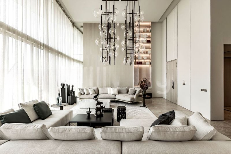 Step into a realm of modern luxury where abundant natural light dances across the marble floors, illuminating the double-height ceilings and designer bubble chandeliers. The expansive living area, framed by floor-to-ceiling windows, offers breathtaking views of the city skyline and cable cars, creating an ambiance that is both sophisticated and inviting.