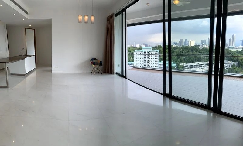 Step into a world of elegance and sophistication at 111 Emerald Hill, where abundant natural light floods the open-concept living space, accentuating the sleek marble-look floor tiles and modern minimalist design. Floor-to-ceiling glass doors offer breathtaking panoramic views of the city skyline and lush greenery, creating an inviting ambiance that feels both spacious and serene.