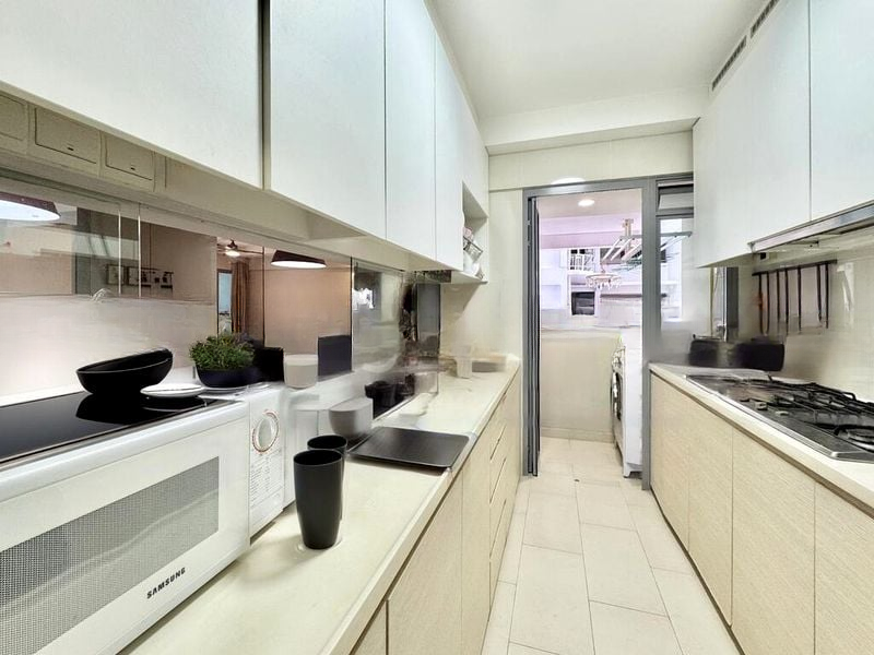 This thoughtfully designed unit features a spacious kitchen with built-in cabinetry, a gas hob, and solid surface countertops, perfect for culinary enthusiasts. The balcony, equipped with roller blinds and a ceiling-mounted retractable drying rack, extends your living space outdoors, inviting you to enjoy the tranquil views. The recessed wall feature in the bedroom adds a touch of elegance, complemented by a reading lamp for your quiet evenings.