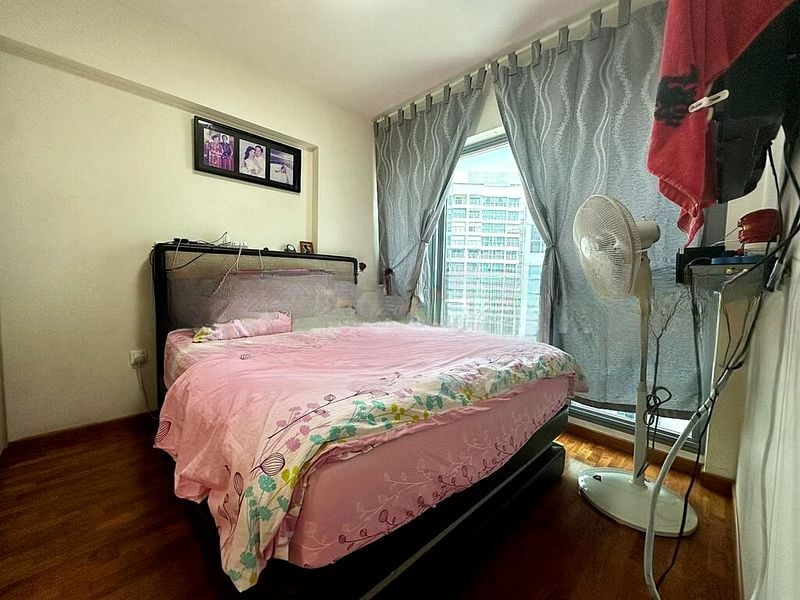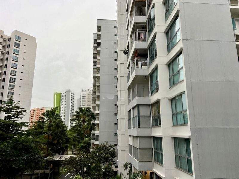 Step into a warm and inviting atmosphere where natural light gently filters through full-height curtains, illuminating the cozy interiors of this well-maintained 2-bedroom flat. The modern high-rise facade offers a delightful view of lush greenery and neighboring residential blocks, creating a serene urban retreat.