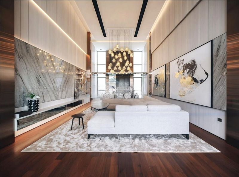 Step into a realm of modern luxury where abundant natural light floods through floor-to-ceiling windows, illuminating the exquisite book-matched marble feature wall. The double-volume high ceiling creates an airy ambiance, while designer cluster glass pendant lighting adds a touch of elegance. The open concept layout seamlessly connects the living, dining, and kitchen areas, inviting you to experience sophisticated living at its finest.