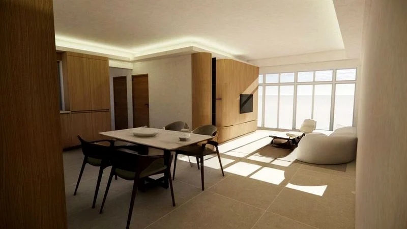 This well-maintained unit features an open layout that seamlessly connects the living room, complete with an L-shaped black sofa and a contemporary black TV console, to the multi-purpose study. The master bedroom boasts a luxurious gold-framed bed and built-in black wardrobes, while the bathrooms are designed for relaxation with a white soaking tub and black rain shower fixtures. Every detail, from the subway tile walls to the round mirror with a leather strap, reflects a commitment to quality and aesthetics.