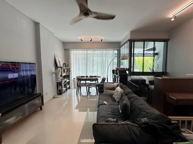 Step into a bright and airy sanctuary at Clementiwoods Condominium, where abundant natural light floods the space through floor-to-ceiling glass doors. The large format floor tiles and track lighting create a modern ambiance, while the picturesque views of the pool and surrounding greenery invite relaxation and tranquility.