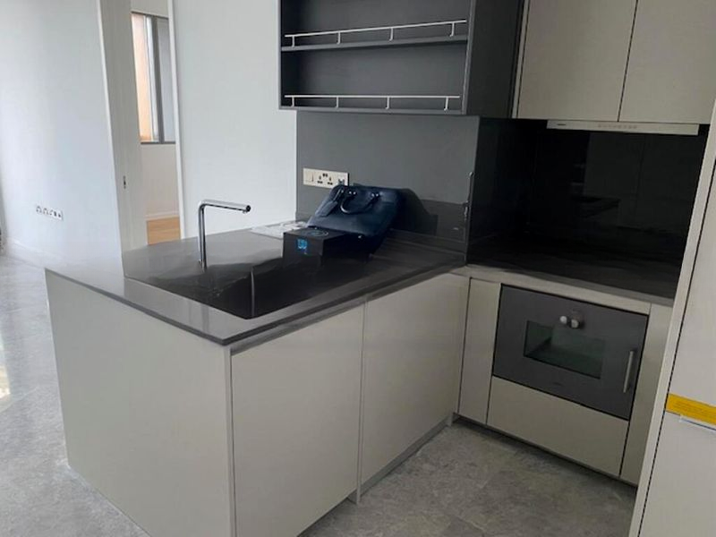This thoughtfully designed 1-bedroom unit features an open layout that maximizes space and functionality. The modern kitchen boasts dark grey countertops, a built-in oven, and sleek white cabinetry, while the bathroom impresses with marble-look tiles, a wall-hung toilet, and a luxurious rain shower. The bedroom, adorned with wooden flooring and a built-in sliding wardrobe, provides a serene retreat.