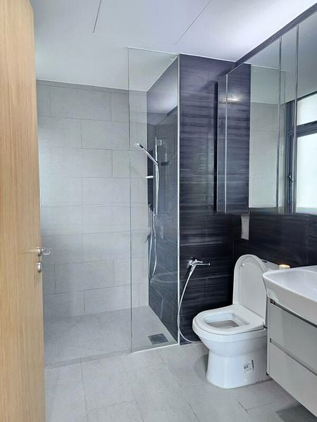 This well-maintained 2-bedroom unit features a thoughtful layout, including a spacious living room with balcony access, a cozy bedroom with a built-in wardrobe, and a versatile study area. The kitchen is equipped with an L-shaped layout, built-in microwave, and induction hob, perfect for culinary enthusiasts. The bathroom boasts elegant black marble-look tiles and a luxurious rain shower, adding a touch of sophistication to your daily routine.