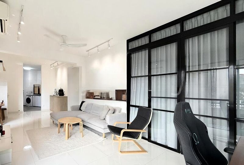 Step into a sanctuary of modern elegance where abundant natural light floods the open-concept living space. The seamless flow from the living room, adorned with track lighting and sleek black-framed glass partitions, invites you to relax while enjoying tranquil views of lush greenery. The minimalist design creates an ambiance that is both refreshing and sophisticated, perfect for unwinding after a long day.