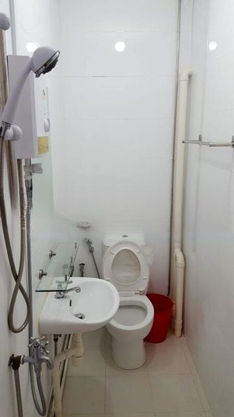 This compact layout maximizes every inch, featuring an integrated kitchenette equipped with a stainless steel sink, silver refrigerator, and a top-load washing machine. The living area is thoughtfully designed with a wall-mounted television, a sleek black metal bed frame, and a dedicated study area, making it perfect for both relaxation and productivity. The bathroom boasts fully tiled walls and an instant water heater shower system for your convenience.