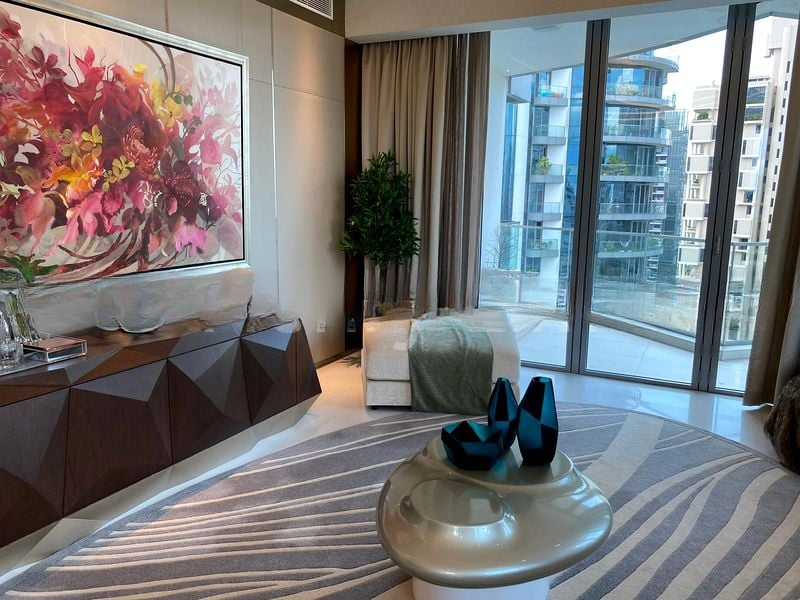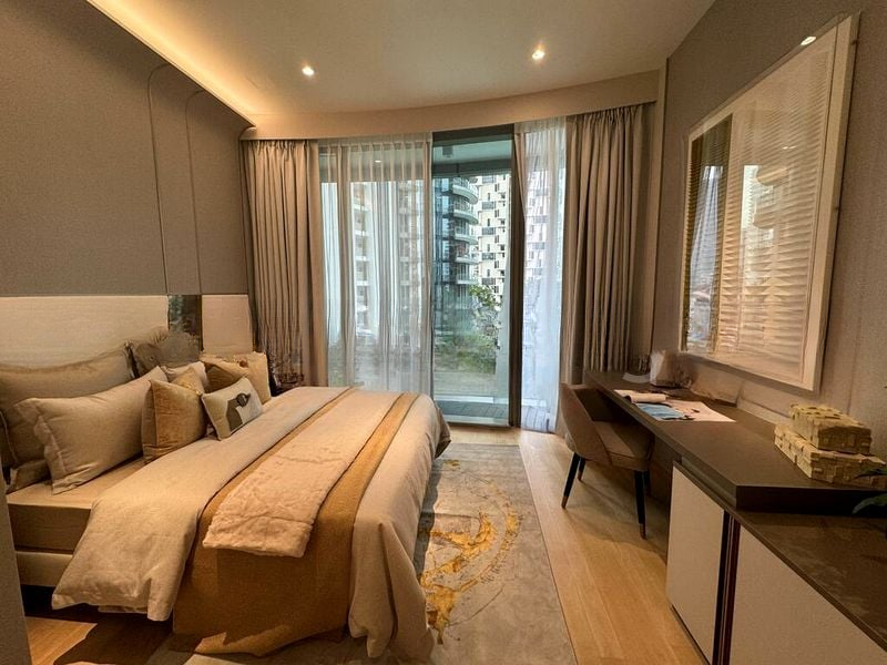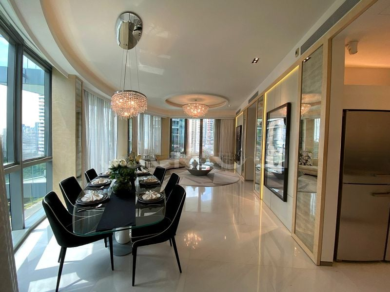 This exquisite unit features four well-appointed bedrooms, including a luxurious master suite with a walk-in closet that boasts custom open shelving and integrated lighting. The gourmet kitchen is a chef's dream, equipped with white cabinetry, dark countertops, a built-in oven, and a gas hob, perfect for culinary creations. The bathrooms are designed with modern finishes, including a glass shower enclosure and wall-hung toilets, ensuring a sophisticated retreat.