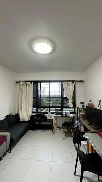 Step into a warm and inviting atmosphere as you enter this beautifully maintained 3-bedroom flat at 106A Punggol Field. The open-concept living and dining area is accentuated by a modern circular LED chandelier and a stylish false ceiling with recessed downlights, creating a cozy ambiance perfect for relaxation and entertaining. The decorative Arabic calligraphy wall art adds a unique touch, while the large integrated TV console and marble-look coffee table enhance the contemporary feel.