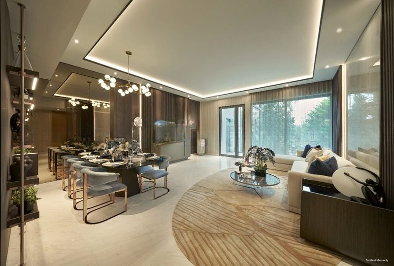 Step into a world of modern luxury as you enter this brand-new designer unit at The Residences at W Singapore Sentosa Cove. Bathed in abundant natural light, the open-concept living area features exquisite marble flooring and a striking fluted wood feature wall, creating an inviting ambiance that seamlessly blends elegance with comfort. Floor-to-ceiling windows frame picturesque views of lush greenery, enhancing the serene atmosphere of your new home.