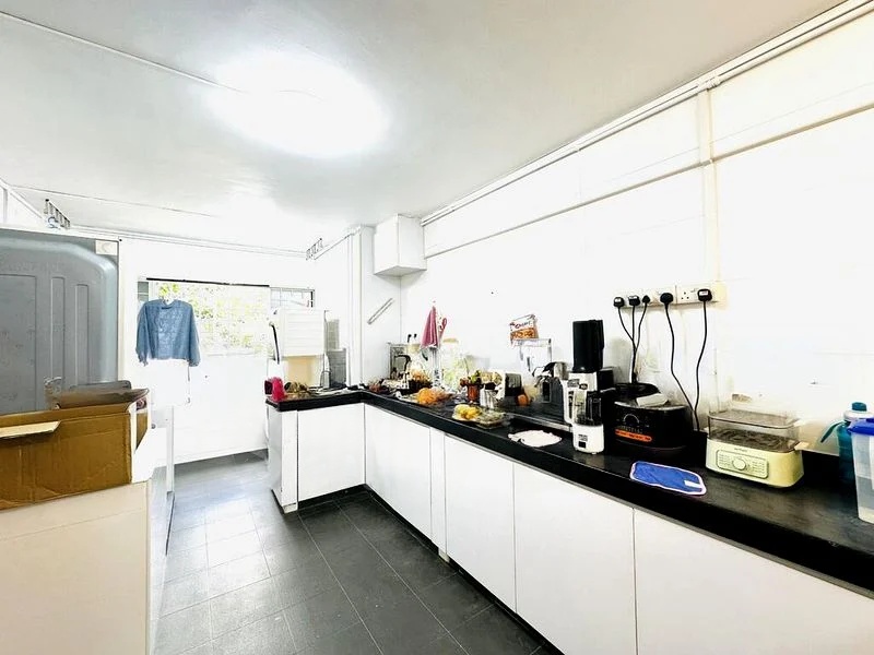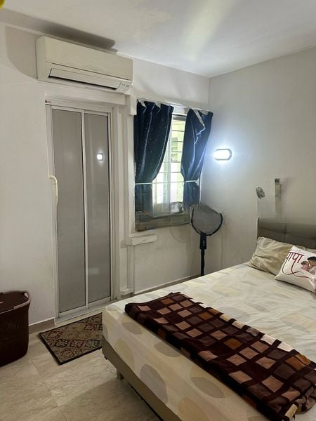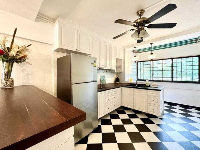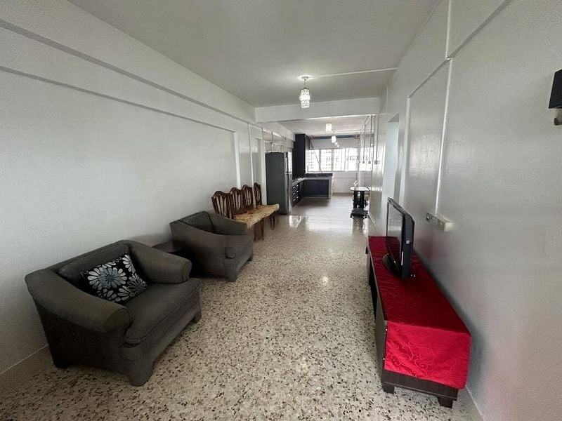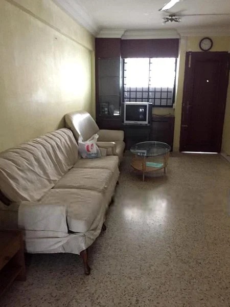 Step into this functional 2-bedroom HDB flat that greets you with a sense of practicality and comfort. The living room, adorned with tiled flooring and a sleek black leather sofa, is complemented by natural light filtering through the windows, creating a warm ambiance. Recessed wall niches add a touch of character, while the ceiling fan ensures a cool breeze throughout.